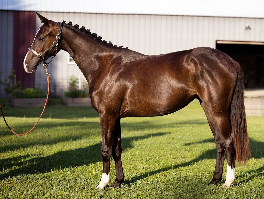 "Cupcake" is a 2019 homebred Hanoverian mare we have retained as a broodmare. She is expecting her first foal in 2025, and is bred to the great Galeno Tyme (Granulit (by Grannus)/Barsoi xx). Galeno Tyme scored an incredible 155.87 (after a 5 point age deduction for being 5 years old at testing) at his 100 day stallion test, which still holds as