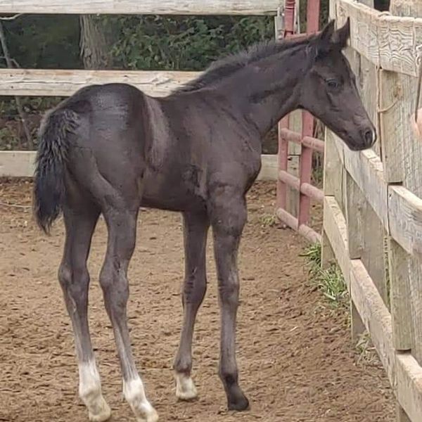 Winsome Lady AK, "Winnie", a black beauty, is by Werbellin, out of Sable CR (Stedinger/Sion/Contender). Winnie has been slow to mature, so will be started this winter as a 4 year old, and should prove to be an incredible hunter prospect. Her movement is classic hunter, but could also cross over nicely as a dressage horse. She LOVES to hop over small jumps on her own and we've seen beautiful natural form so far. Up to date pictures and video coming soon.